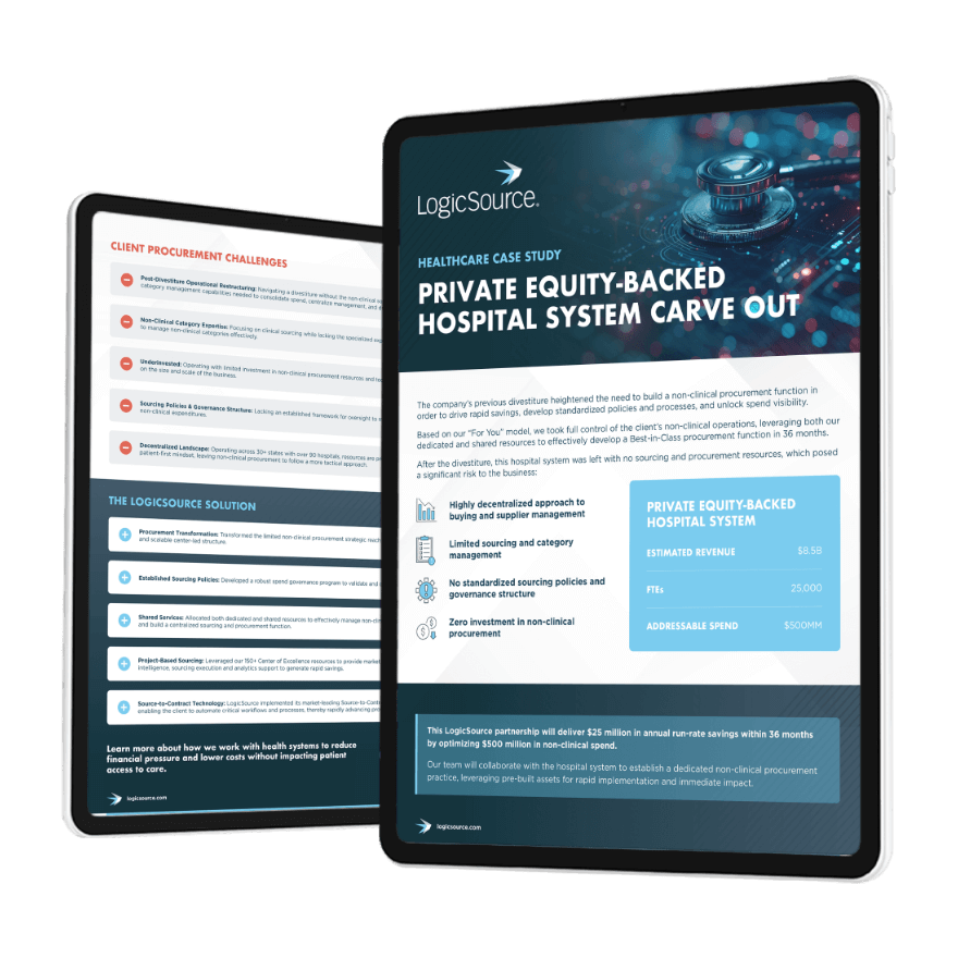 After a divestiture left this $8.5B private equity-backed hospital system with zero non-clinical procurement resources, the organization faced significant business risk with 25,000 employees and no sourcing capabilities.